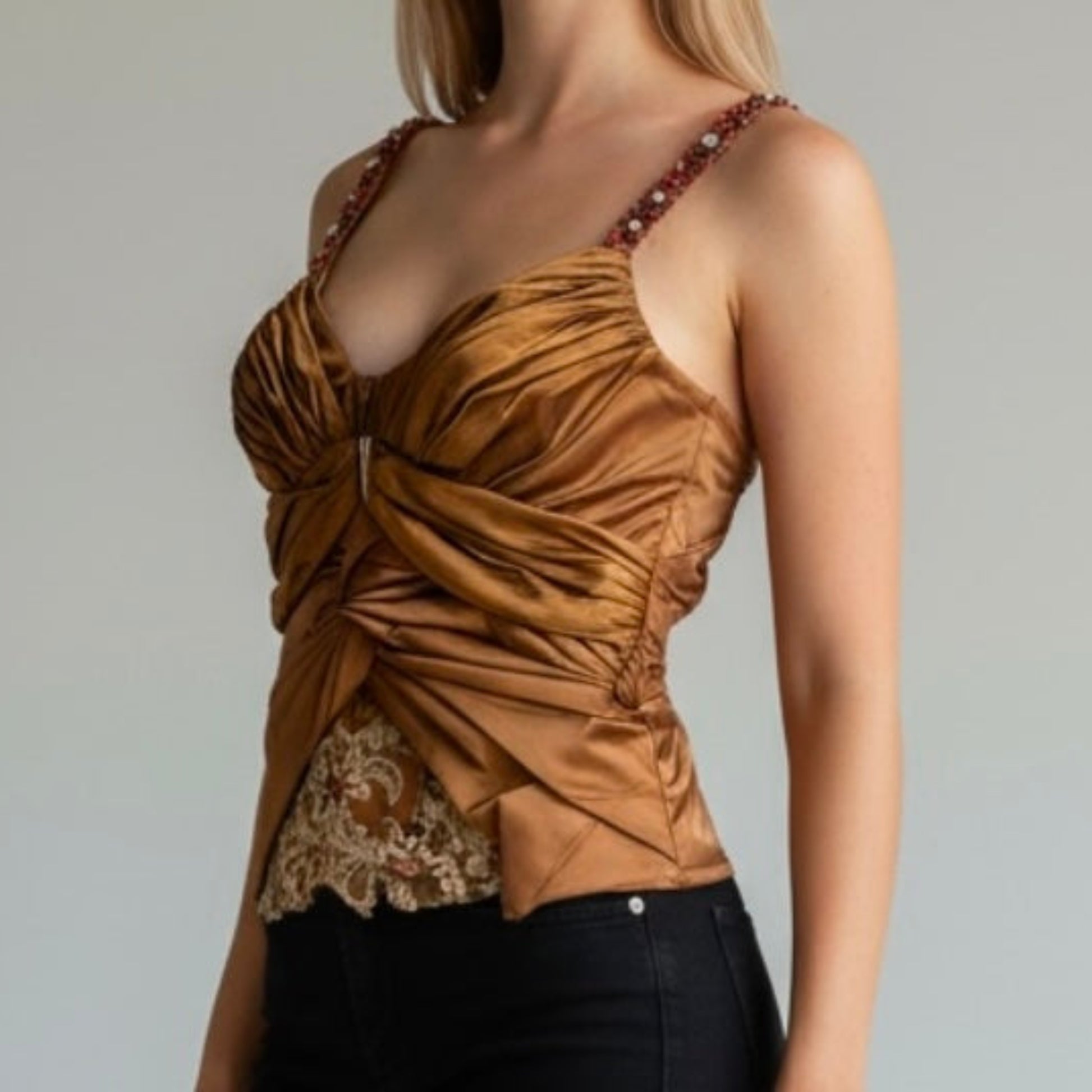 Ruched top with beaded detailing for understated sophistication.